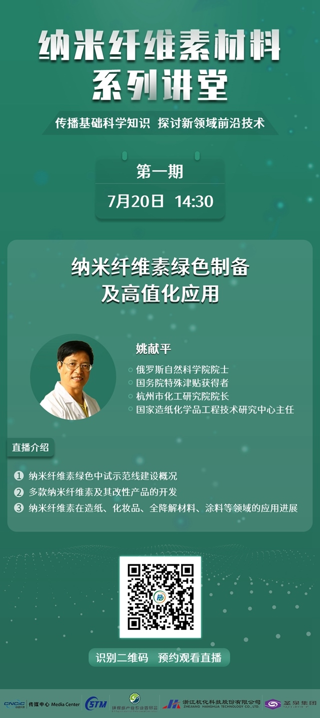 納米纖維素以植物纖維為原料,資源豐富,綠色低碳;具有輕質(zhì)高強、可生物降解等特點,被視為“后碳纖維時代”的高性能前沿新材料;可應(yīng)用于全降解及輕質(zhì)高強材料、高阻隔生物材料、造紙、涂料、化妝品、醫(yī)藥化工等領(lǐng)域,未來發(fā)展空間巨大。為此,CSTM生物基化工材料技術(shù)委員會、環(huán)保紙產(chǎn)業(yè)專業(yè)委員會、北京生產(chǎn)力學(xué)會、杭州化工研究院、西南工業(yè)大學(xué)、南京林業(yè)大學(xué)特攜手中國化工信息中心傳媒中心圍繞納米纖維素的新技術(shù)與高值化應(yīng)用,精心組織海內(nèi)外專家學(xué)者開設(shè)“納米纖維素材料系列講堂”,旨在傳播納米纖維素相關(guān)基礎(chǔ)科學(xué)知識,共同探討相關(guān)新領(lǐng)域的前沿技術(shù),加強學(xué)術(shù)界與工業(yè)界互聯(lián)互通,促進產(chǎn)研對接,助力生物質(zhì)基功能材料行業(yè)高質(zhì)量發(fā)展。