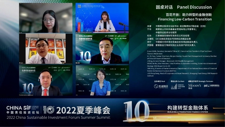 隨后的圓桌對話環(huán)節(jié)圍繞“助力轉(zhuǎn)型的金融創(chuàng)新”展開,由China SIF秘書長、商道融綠執(zhí)行副總裁關(guān)睿主持。原摩根士丹利華鑫基金管理有限公司董事長、China SIF理事于華博士,貝萊德建信理財有限責(zé)任公司總經(jīng)理紀(jì)冰,GIC全面投資組合可持續(xù)投資部副總裁王德銳,中國銀行間市場交易商協(xié)會市場創(chuàng)新部負(fù)責(zé)人韓寧,首鋼基金萬物研究院企業(yè)及資產(chǎn)研究負(fù)責(zé)人羅鵬程就轉(zhuǎn)型金融與綠色金融的關(guān)系、轉(zhuǎn)型金融產(chǎn)品現(xiàn)狀、轉(zhuǎn)型金融的發(fā)展前景及面臨的挑戰(zhàn)展開了熱烈討論。韓寧介紹了交易商協(xié)會近期推出支持傳統(tǒng)行業(yè)低碳轉(zhuǎn)型發(fā)展的轉(zhuǎn)型債券相關(guān)情況。