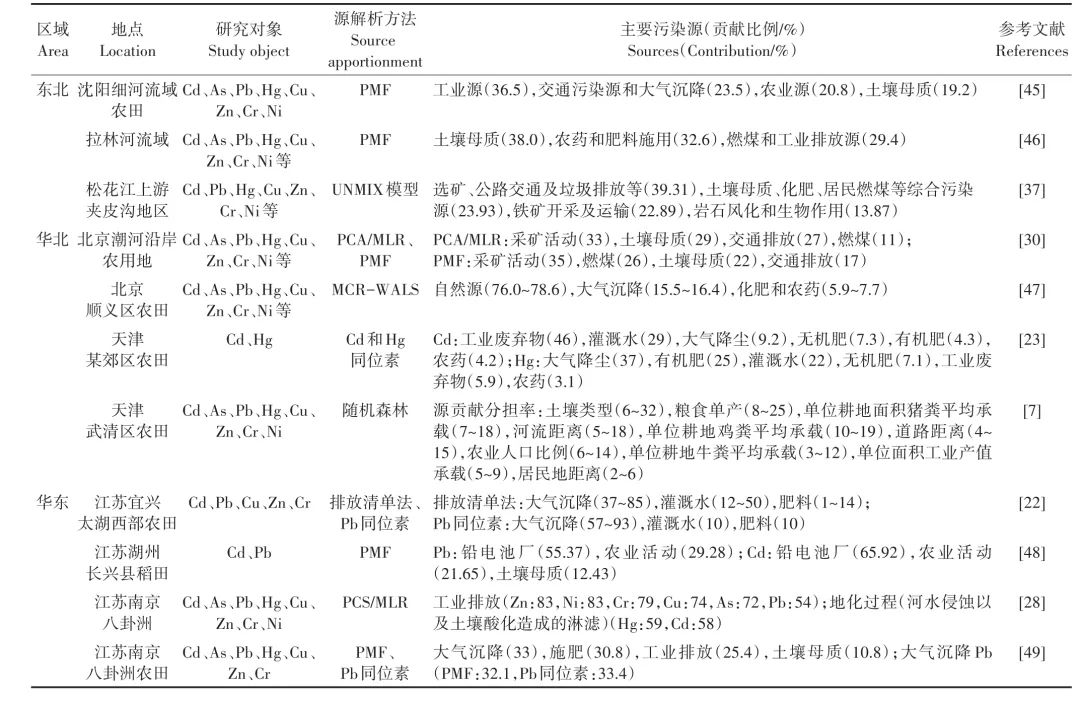 關(guān)于華北地區(qū)土壤重金屬源解析的近期文章共發(fā)現(xiàn)了13篇,涉及北京、天津、河北、山西和內(nèi)蒙古地區(qū)的2831個(gè)表層土壤樣品,所采用的定性源解析方法主要為PCA、相關(guān)性分析、空間分析等,定量源解析方法有PMF、PCA-MLR、同位素比值法等(表3)??傮w上,華北地區(qū)農(nóng)田土壤中的主要污染重金屬元素是Cd,其次有Cu、Hg、Zn、Pb等。該地區(qū)農(nóng)田土壤中的As、Cr、Ni主要受土壤母質(zhì)的控制,個(gè)別地方的As還有采礦活動(dòng)和大氣沉降的貢獻(xiàn);除此以外,其余重金屬元素都受到一定程度的外源污染。Cd、Cu和Zn的污染來源仍以農(nóng)業(yè)活動(dòng)(肥料、農(nóng)藥、灌溉水)為主,部分地區(qū)Cd還受到工業(yè)活動(dòng)的影響。對(duì)于Pb的來源,土壤母質(zhì)、采礦活動(dòng)、大氣沉降、污水灌溉等都有一定程度的貢獻(xiàn)。Hg主要受大氣沉降和灌溉水控制,局部地區(qū)有工業(yè)活動(dòng)的影響。對(duì)于工業(yè)區(qū)周邊的非農(nóng)田土壤來說,重金屬的累積明顯與工業(yè)活動(dòng)、燃煤、交通排放緊密相關(guān)。