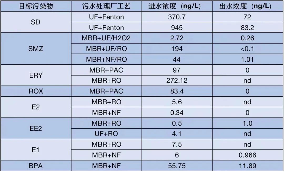 這3種投加方式均可實(shí)現(xiàn)對(duì)新污染物的穩(wěn)定去除,但對(duì)比來(lái)看:選擇適宜的PAC,優(yōu)化其投加量可提高吸附去除效率。有研究表明,隨著溶解性有機(jī)碳的增加,PAC對(duì)新污染物的吸附效率逐漸降低,當(dāng)二級(jí)出水中有機(jī)碳在5~10mg/L范圍內(nèi)時(shí),需要投加10~20mg/LPAC,可達(dá)到對(duì)新污染物的有效去除(>80%),同時(shí)能達(dá)到對(duì)有機(jī)碳最高40%的去除率,水力停留時(shí)間為20~30min,PAC的停留時(shí)間為1~2d。采用PAC吸附作為升級(jí)改造工藝去除新污染物,電能消耗將提高10%~30%,總成本將提高5%~35%。在實(shí)際運(yùn)行中,PAC吸附工藝會(huì)產(chǎn)生大量的含炭污泥,使污泥處理能耗相應(yīng)增加。據(jù)研究數(shù)據(jù)表明,PAC投加量為10~20 mg/L時(shí),PAC吸附工藝的電能消耗約為0.02 kWh/m3,后加砂濾單元產(chǎn)生的電能消耗約為0.06 kWh/m3。采用PAC回流到生物池的工藝比不采用回流的工藝對(duì)新污染物的去除率可提高10%~50%,但同時(shí)也會(huì)增加5%~10%的污泥。GAC過(guò)濾器一般置于常規(guī)污水處理廠工藝中的二沉池之后,既可吸附又可過(guò)濾,它可以連續(xù)運(yùn)行,無(wú)需后續(xù)的分離步驟。但GAC成本較高,再生困難,因此在實(shí)際應(yīng)用中不如PAC廣泛。活性炭吸附過(guò)程受許多因素的影響,包括活性炭本身特性(如所用材料、比表面積和表面化學(xué)特性等)、新污染物的物化特性(主要是疏水性、溶解性、電荷和分子大小等)、溶液的化學(xué)特性和組分(如可溶解性有機(jī)物DOM等)和活性炭投加量、吸附質(zhì)的濃度等其他基本參數(shù)。在新污染物的去除技術(shù)中,膜分離技術(shù)同樣也受到了很多關(guān)注,其中以納濾(NF)和反滲透(RO)對(duì)新污染物的去除效果最好。NF和RO技術(shù)均采用高壓膜,由于它們的孔徑極小,可以截留較小分子量物質(zhì),一般應(yīng)用于無(wú)機(jī)離子和有機(jī)污染物的截留。RO膜可以有效截留(>90%)水中有機(jī)小分子物質(zhì);雖然NF膜由于孔徑稍大截留效果不如RO膜,但NF技術(shù)的能耗較低,在對(duì)新污染物的去除中,具有明顯的操作和成本優(yōu)勢(shì)。值得一提的是,低壓膜如微濾(MF)膜和超濾(UF)膜由于孔徑較大,不足以截留大部分 新污染物,但因?yàn)槲鬯幚韽S二級(jí)出水中仍含有相對(duì)較高濃度的有機(jī)物,會(huì)對(duì)NF/RO的截留效果造成不利影響,所以MF/UF經(jīng)常作為NF/RO的前處理工藝。有機(jī)物是導(dǎo)致膜污染的主要原因,長(zhǎng)期運(yùn)行時(shí)會(huì)造成NF/RO膜通量下降、截留效果降低,因此在處理二級(jí)出水時(shí),采用MF/UF作為前處理工藝,對(duì)于維持NF/RO的長(zhǎng)期穩(wěn)定運(yùn)行十分必要。膜對(duì)新污染物的截留率取決于新污染物的物化特性(分子大小和重量,電荷和疏水性)、膜特性(膜材料、孔徑等)及操作條件等。值得一提的是,不同材料的膜對(duì)同種新污染物的截留效果不同,同種膜對(duì)不同新污染物的截留效果也不同。目前將NF/RO技術(shù)作為實(shí)際污水處理廠的升級(jí)改造工藝的報(bào)道并不多,其主要限制因素是能耗較高、膜污染以及膜分離過(guò)程中產(chǎn)生大量需要處理的濃縮液等。膜生物反應(yīng)器(MBR)具有污泥濃度高、生物種類多、出水水質(zhì)穩(wěn)定、固液分離能力強(qiáng)等特點(diǎn)。MBR的膜表面能夠有效的截留有機(jī)污染物,使污染物與污水進(jìn)行分離,所以MBR對(duì)大多數(shù)的有機(jī)污染物的截留效果較好。但較長(zhǎng)的SRT也可能會(huì)導(dǎo)致MBR中懸浮基質(zhì)活性生物量減少,影響對(duì)抗生素的去除。而且MBR對(duì)有機(jī)污染物的去除效率還受到污泥濃度、溫度和pH值等因素的影響。通過(guò)研究MBR工藝在污水處理廠中對(duì)新興污染物的去除,有學(xué)者發(fā)現(xiàn)其對(duì)E1、E3和BPA的去除率達(dá)到了100%;還有學(xué)者利用MBR工藝處理污水中的抗生素和新興生物群落,研究表明其對(duì)TC和CTC的去除率分別為93.6%和83.9%。盡管深度處理能夠去除大部分的新污染物,但仍有一部分新污染物沒(méi)有被去除。為此,在實(shí)際污水處理工藝中通常把多種深度處理技術(shù)聯(lián)合使用,取長(zhǎng)補(bǔ)短,有效地提高有機(jī)污染物的去除效率。根據(jù)文獻(xiàn)資料,小編列舉了多種組合工藝對(duì)幾種典型新污染物的去除效果,由圖中可以看出組合工藝對(duì)于新污染物的去除效率較高。這是一種高效的水處理工藝,對(duì)污水處理廠出水水質(zhì)有了很大的提升,這類聯(lián)合工藝對(duì)有機(jī)污染物的去除具有顯著的效果以及使用價(jià)值。我國(guó)新污染物防范治理起步較晚、工作基礎(chǔ)薄弱1、我國(guó)對(duì)于部分新污染物污染底數(shù)不清雖然在2015年提出開展全國(guó)性環(huán)境激素整體監(jiān)測(cè)行動(dòng),但由于缺乏環(huán)境內(nèi)分泌干擾物(EDCs)的篩選和評(píng)估框架,以及監(jiān)測(cè)范圍和技術(shù)限制等原因,導(dǎo)致目前仍然無(wú)法全面掌握我國(guó)近年來(lái)環(huán)境內(nèi)分泌干擾物(EDCs)的生產(chǎn)、使用和排放現(xiàn)狀。同時(shí),大多數(shù)新污染物還未納入環(huán)境監(jiān)測(cè)體系內(nèi),對(duì)于全氟辛烷磺酸(PFOS)等新污染物缺乏監(jiān)管,導(dǎo)致許多全
