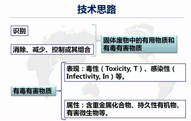 固廢管理的技術思路分為兩類,一方面應識別固廢中的有用物質(zhì)對其進行資源化利用;而另一方面對表現(xiàn)出毒性、感染性等含重金屬化合物、持久性有機物和有害微生物等有毒有害物質(zhì)需著力消除、減少、控制或使用組合措施。廢物處理中通常需要加入能量與化學物質(zhì),在轉(zhuǎn)化得到產(chǎn)品的同時可能產(chǎn)生大氣排放、水體排放與工藝殘余物,需要關注與控制。