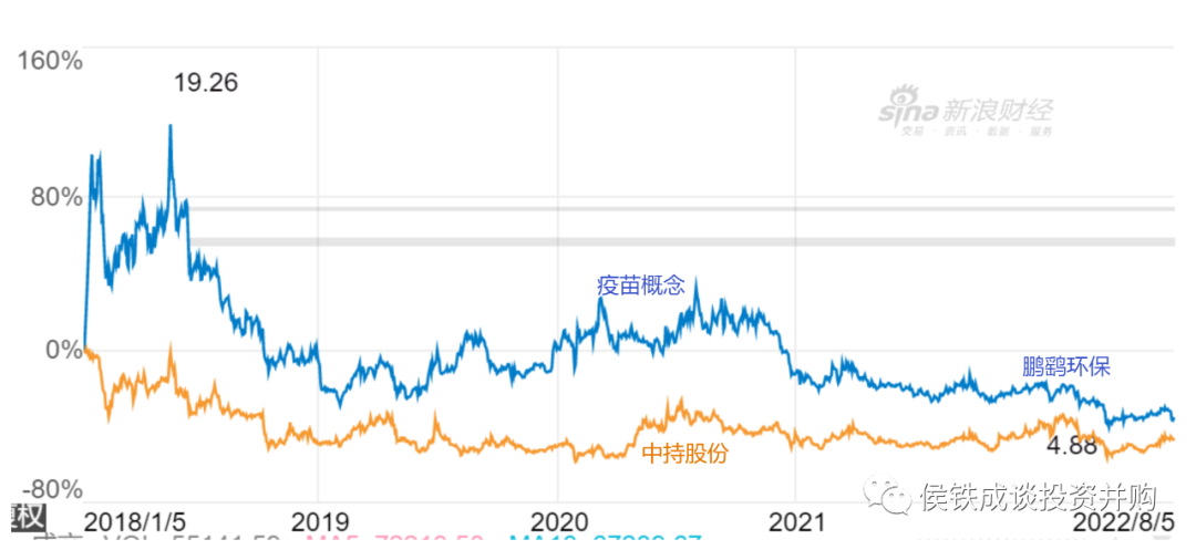 鵬鷂環(huán)保2018年1月份A股上市,增發(fā)8000萬(wàn)股,融資6個(gè)多億。2018年,公司市值借著行業(yè)東風(fēng)達(dá)到150億,然后環(huán)保行業(yè)一路走低,鵬鷂市值也跟著一路下滑。2020年公司投資了疫苗概念股,市值反彈到80億。概念過(guò)后,一路走低到今天的38億。