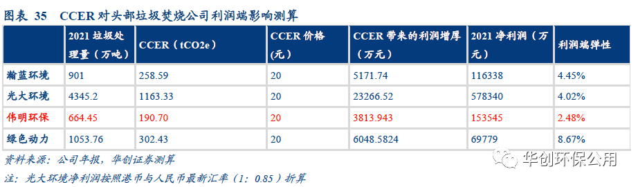 最理想情況下,CCER收入在利潤端可為垃圾焚燒頭部企業(yè)帶來3%-9%的增厚。我們選取瀚藍(lán)環(huán)境、光大環(huán)境、偉明環(huán)保和綠色動力四家頭部垃圾焚燒上市公司進(jìn)行測算,在假設(shè)公司所處理的垃圾全部可以轉(zhuǎn)化為CCER的情況下,按照2021年的垃圾處理量和凈利潤,CCER收入可分別為瀚藍(lán)環(huán)境、光大環(huán)境、偉明環(huán)保、綠色動力帶來4.45%/4.02%/2.48%/8.67的利潤端彈性。