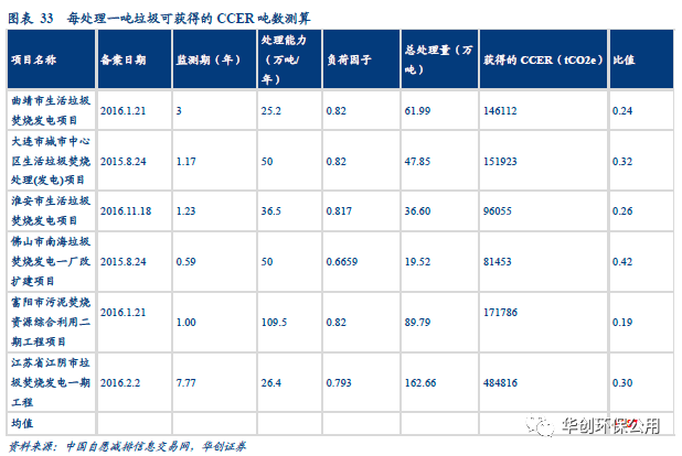 我們采用垃圾處理量與所獲得CCER噸數(shù)之比作為統(tǒng)計(jì)口徑,從簽發(fā)和備案項(xiàng)目中選取了較為典型的垃圾焚燒項(xiàng)目計(jì)算平均值,根據(jù)測算垃圾焚燒企業(yè)每處理一噸垃圾,平均獲得0.287噸CCER,在假設(shè)CCER價格為20元/噸的情況下,噸垃圾增收約為6元。