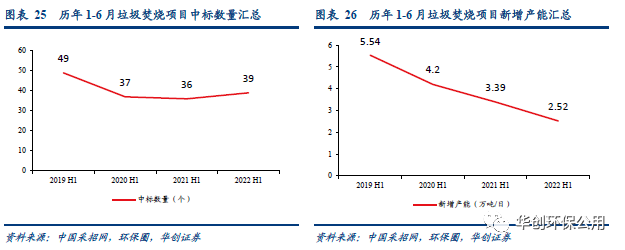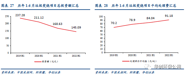 根據(jù)不完全統(tǒng)計(jì),2022年1-6月全國垃圾焚燒發(fā)電項(xiàng)目開標(biāo)數(shù)量為39個,投資總額約為145.09億人民幣,新增產(chǎn)能2.52萬噸/日,垃圾處理單價平均值為91.18元/噸。盡管中標(biāo)項(xiàng)目數(shù)量較去年同期有所提升,但訂單的釋放省份多數(shù)位于中部地區(qū),日處理量超過1000噸僅6個(2021年同期為13個),故新增產(chǎn)能和投資額同比分別下滑25.66%和13.96%至2.52萬噸與145.09億元。但后補(bǔ)貼時代,新中標(biāo)的垃圾焚燒發(fā)電項(xiàng)目噸垃圾處置費(fèi)上浮明顯,較2021H1平均值84.04元/噸增長8.5%至91.18元。