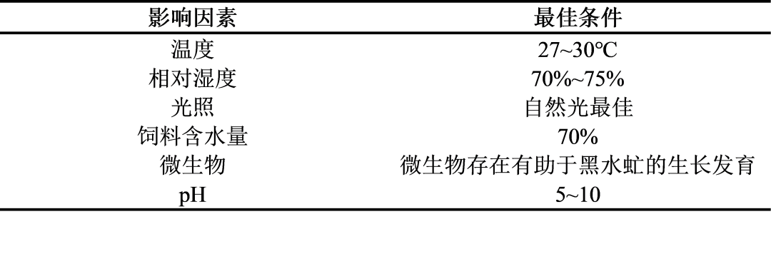 (1)溫度:黑水虻幼蟲的最適生長發(fā)育溫度是27~30℃。低于26℃成蟲不產(chǎn)卵,而溫度過高會導(dǎo)致幼蟲停止攝食。