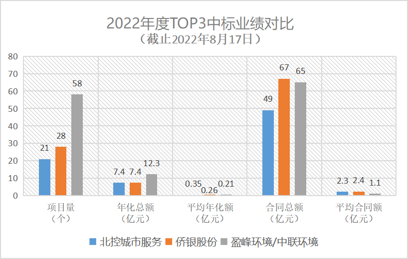 截止8月17日,北控城市服務(wù)2022年度中標(biāo)項(xiàng)目總額達(dá)到21個(gè),中標(biāo)項(xiàng)目合同總額超過(guò)49億元,中標(biāo)項(xiàng)目年化總額7.4億元。中標(biāo)項(xiàng)目年化總額與僑銀股份并列第二,中標(biāo)項(xiàng)目合同總額暫列第三。