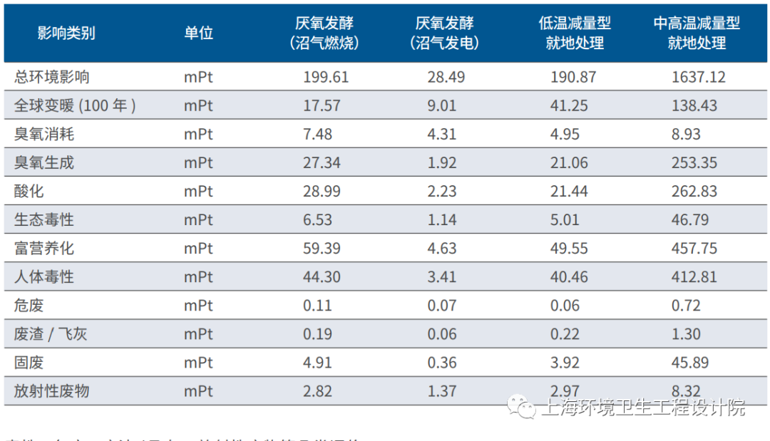 本文對厭氧發(fā)酵(沼氣燃燒)、厭氧發(fā)酵(沼氣發(fā)電)、低溫減量型就地處理、中高溫減量型就地處理四種典型工藝進(jìn)行了生命周期環(huán)境影響對比研究。通過數(shù)據(jù)收集、清單分析和結(jié)果評價(jià),得出以下結(jié)論: