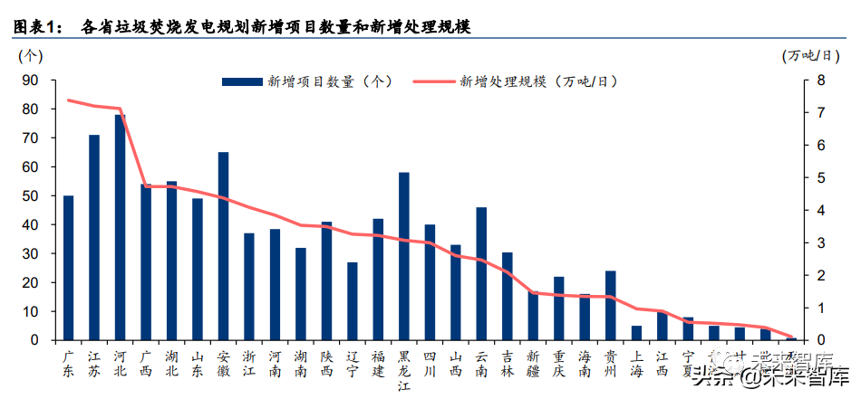2017 年 12 月 12 日,國家發(fā)改委聯(lián)合五部委下發(fā)《關(guān)于進(jìn)一步做好生活垃圾焚燒發(fā)電廠規(guī) 劃選址工作的通知》,要求各?。▍^(qū)、市)應(yīng)編制本地區(qū)省級生活垃圾焚燒發(fā)電中長期專項(xiàng) 規(guī)劃。截至 2022 年 5 月底,全國已有 21 個(gè)?。▍^(qū)、市)發(fā)布中長期專項(xiàng)規(guī)劃及修訂稿, 13 個(gè)省(區(qū)、市)相繼發(fā)布涉及生活垃圾焚燒發(fā)電的“十四五”規(guī)劃,整理后得到 29 個(gè) 省(區(qū)、市)規(guī)劃新增項(xiàng)目數(shù)量合計(jì) 974 個(gè),新增處理規(guī)模合計(jì) 84.3 萬噸/日。其中,規(guī)劃 新增項(xiàng)目數(shù)量前三的?。▍^(qū)、市)為河北、江蘇和安徽,分別為 78/71/65 個(gè),規(guī)劃新增處 理規(guī)模前三的省(區(qū)、市)為廣東、江蘇和河北,分別為 7.4/7.2/7.1 萬噸/日。