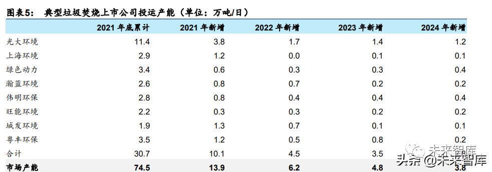 同時(shí),我們選取光大環(huán)境等 8 家典型垃圾焚燒上市公司,根據(jù)我們對投產(chǎn)項(xiàng)目的統(tǒng)計(jì)和對 在建項(xiàng)目的投產(chǎn)進(jìn)度預(yù)測,8 家典型公司 2021-2024 年新增投運(yùn)產(chǎn)能合計(jì) 10.1/4.5/3.5/2.8 萬噸/日,2021 年垃圾焚燒市場新增投運(yùn)產(chǎn)能 13.9 萬噸/日。假設(shè) 2022-2024 年市場與典型 公司新增投運(yùn)產(chǎn)能之比維持 2021 年水平,測算得到 2022-2024 年市場新增投運(yùn)產(chǎn)能為 6.2/4.8/3.8 萬噸/日,與自上而下測算結(jié)果基本一致,從而驗(yàn)證 2022-2024 年市場新增投運(yùn) 產(chǎn)能將明顯回落。