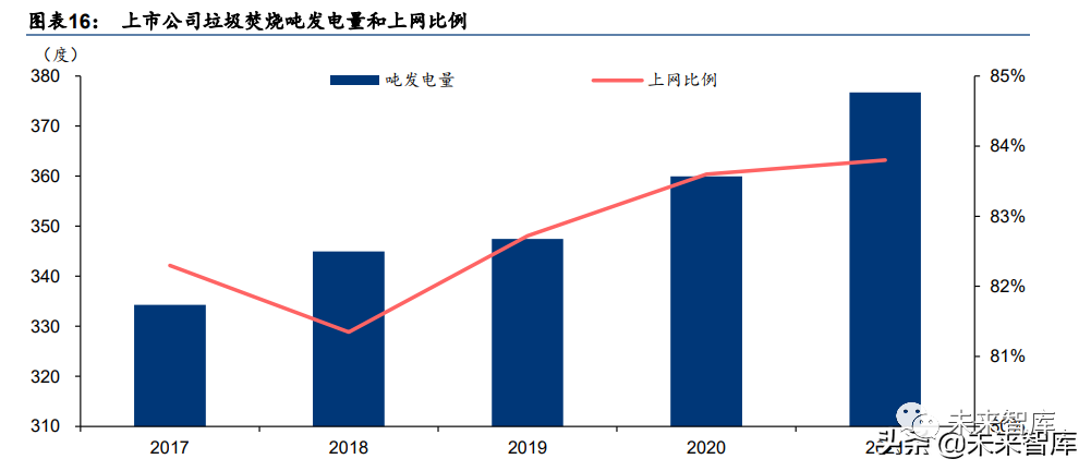 噸發(fā)電量與上網(wǎng)比率的雙重增長帶動(dòng)噸上網(wǎng)電量顯著提升。將 8 家典型公司的噸發(fā)電量進(jìn) 行整理和計(jì)算,發(fā)現(xiàn) 2017-2021 年噸發(fā)電量由 334 度提升至 377 度,我們認(rèn)為主要有以下 兩方面原因:1)垃圾分類帶動(dòng)入爐垃圾熱值水平上升。廚余垃圾含水量高,熱值較低,而 近年來垃圾分類在全國范圍內(nèi)的推廣,使廚余垃圾與生活垃圾相分離,導(dǎo)致入爐焚燒的廚 余垃圾占比減少;2)爐排爐技術(shù)進(jìn)一步推廣。2016 年全國垃圾焚燒廠中,使用爐排爐技 術(shù)的焚燒爐占比為 78%,2020 年占比已經(jīng)提升至 85%以上,相比于流化床技術(shù),爐排爐 技術(shù)能使垃圾燃燒的更加充分,從而提升噸發(fā)電量,我們預(yù)計(jì) 2022-2025 年噸發(fā)電量為 379/381/383/385 度。另外,隨著行業(yè)整體運(yùn)營水平上升,各企業(yè)致力于生產(chǎn)環(huán)節(jié)節(jié)能降耗, 降低廠用電率,行業(yè)整體上網(wǎng)比率也持續(xù)增長,2018-2021 年間由 81.3%增長至 83.8%, 我們預(yù)計(jì) 2022-2025 年上網(wǎng)比例逐年提升 0.2 個(gè)百分點(diǎn)至 84.6%。以上雙重因素帶動(dòng)噸上 網(wǎng)電量顯著提升。