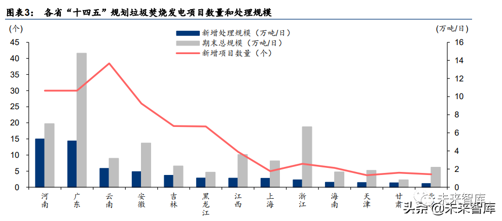 “十四五”規(guī)劃提出,到 2025 年底,全國城鎮(zhèn)生活垃圾焚燒處理能力達(dá)到 80 萬噸/日左右, 相對“十三五”末期增量空間為 22 萬噸/日;城市生活垃圾焚燒處理能力占比 65%左右,相對 “十三五”末期提升空間仍有 20 個(gè)百分點(diǎn)。此外 13 個(gè)省(區(qū)、市)相繼發(fā)布涉及生活垃圾焚 燒發(fā)電的“十四五”規(guī)劃,結(jié)合國家統(tǒng)計(jì)局公布的 2020 年生活垃圾焚燒發(fā)電產(chǎn)能數(shù)據(jù),我 們測算得到“十四五”期間 13 個(gè)省(區(qū)、市)規(guī)劃新增垃圾焚燒項(xiàng)目 204 個(gè),新增產(chǎn)能 21.2 萬噸/日,其中,規(guī)劃新增處理規(guī)模前二的?。▍^(qū)、市)為河南和廣東,分別為 5.3/5.1 萬噸/日,對應(yīng)規(guī)劃新增項(xiàng)目數(shù)量均為 30 個(gè)。