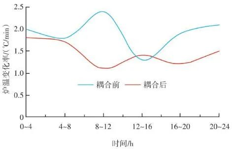 生活垃圾焚燒爐的排放物在滿足GB 18485—2014 生活垃圾焚燒污染控制標(biāo)準(zhǔn)的前提下,為保障焚燒爐的長期安全運(yùn)行、汽機(jī)系統(tǒng)的穩(wěn)定高效運(yùn)轉(zhuǎn),通常通過爐溫和主蒸汽流量這兩個因素來判斷鍋爐運(yùn)行是否良好。以下工況為某項(xiàng)目單臺750 t/d生活垃圾焚燒爐在紅外熱成像管理系統(tǒng)應(yīng)用前、應(yīng)用后兩段時期的實(shí)際運(yùn)行參數(shù),以此實(shí)例來解析該系統(tǒng)的運(yùn)行效果。該項(xiàng)目額定主蒸汽流量為74 t/h。如圖10所示,藍(lán)色實(shí)線為耦合前24 h變化率波動范圍,紅色實(shí)線為耦合后24 h變化率波動范圍。爐溫變化率指的是焚燒爐上、中、下3層共計(jì)9個溫度測點(diǎn)的熱電偶反饋溫度在每分鐘內(nèi)升高或降低的溫度值,而溫度變化率波動范圍指的是單位時間內(nèi)溫度變化率最高值與最低值之間的溫度差,該差值越大表明爐溫波動越大,即工況越不穩(wěn)定,波動范圍越小表明工況越平穩(wěn)。此期間溫度也一直未低于環(huán)保部要求的最低限(850 ℃/2 s),均介于950~1 050 ℃。焚燒爐主蒸汽流量曲線如圖11所示,左側(cè)縱坐標(biāo)為主蒸汽流量,額定蒸發(fā)量74 t/h。圖中藍(lán)色實(shí)線為紅外熱成像系統(tǒng)與ACC系統(tǒng)耦合前24 h的主蒸汽流量曲線,紅色虛線為紅外熱成像系統(tǒng)與ACC系統(tǒng)耦合后24 h的主蒸汽流量曲線。表1中參數(shù)可以計(jì)算出耦合前后焚燒爐爐溫波動范圍相對縮減了24.5%,焚燒爐爐溫均值提高了1.2%,蒸發(fā)量波動幅度縮減了3個百分點(diǎn),主蒸汽流量提高了1.4 t/h。經(jīng)過對主要運(yùn)行參數(shù)的定量分析,可以看出結(jié)合了紅外熱成像系統(tǒng)的ACC系統(tǒng)在功能性和穩(wěn)定性上有顯著提升。表1 重要運(yùn)行參數(shù)統(tǒng)計(jì)基于目前紅外熱成像管理系統(tǒng)的功能,正在逐步進(jìn)行焚燒爐溫度場重構(gòu)工作,對于紅外探頭收集的大量溫度點(diǎn)實(shí)時數(shù)據(jù)進(jìn)行整合并進(jìn)行紅外溫度顯示。傳感器擁有1 440×1 080個像素,其中每個像素都有對應(yīng)的溫度值,該溫度值隨著目標(biāo)溫度的變化在800~1 600 ℃對應(yīng)變化,那么我們就可以將800~1 600 ℃這個范圍內(nèi)的溫度數(shù)據(jù)映射到顏色空間中特定的彩色序列,只要在程序中明確規(guī)定溫度和顏色之間的映射函數(shù)和映射表即可實(shí)現(xiàn)相應(yīng)的偽彩顯示,即熱像圖的形式。這樣可為運(yùn)行人員提供更為直觀、立體的參考依據(jù),待溫度場重構(gòu)系統(tǒng)成熟后,再與ACC系統(tǒng)進(jìn)行結(jié)合,進(jìn)一步提高全廠的自動化程度。紅外熱成像管理系統(tǒng)在生活垃圾焚燒控制領(lǐng)域,與傳統(tǒng)ACC系統(tǒng)經(jīng)過合理的設(shè)計(jì)、安裝、邏輯耦合后,對焚燒自動化有以下幾個方面的改變和提升。1)視野擴(kuò)大。改變探頭安裝位置后,成像角度由仰視變?yōu)楦┮?,拓寬了爐內(nèi)火焰視場角度?;鹧娉上裥螤钣伞耙幻婊饓Α?提升為“一片火?!?。在具備最基本的“遠(yuǎn)程看火”功能前提下,為運(yùn)行人員提供更強(qiáng)有力的參考依據(jù)。2)測溫準(zhǔn)確。紅外熱成像原理相比傳統(tǒng)光學(xué)成像原理,增加了溫度反饋功能。利用軟件管理系統(tǒng),將溫度信號解析,并與實(shí)際區(qū)域一一對應(yīng)。3)靈活性高。溫度測點(diǎn)的選定可通過管理軟件任意選擇,調(diào)試結(jié)束后仍可根據(jù)實(shí)際工況進(jìn)行設(shè)置和改變。4)耦合性強(qiáng)。紅外熱成像管理系統(tǒng)除現(xiàn)有功能外更像是一個平臺,可以對現(xiàn)有溫度參數(shù)和火焰狀態(tài)的大量數(shù)據(jù)進(jìn)行進(jìn)一步提升和利用,例如正在進(jìn)行的溫度場成像功能優(yōu)化和升級工作。5)效益提升。紅外熱成像管理系統(tǒng)融入ACC系統(tǒng)后,對焚燒爐溫度、鍋爐主蒸汽流量的穩(wěn)定性有顯著提升。對減少運(yùn)行人員工作量、增加產(chǎn)汽量、發(fā)電量等焚燒廠經(jīng)濟(jì)效益方面有不同程度提升。