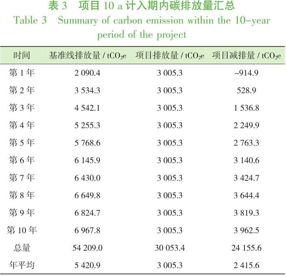 由CCER方法學(xué)計算可得,10 a計入期內(nèi)項目平均每年基準線排放量為5420.9 tCO2e,總項目排放量為3005.3 tCO2e,總減排量為2415.6 tCO2e。計算得出10 a計入期內(nèi)的項目碳排放量如表3所示。計入期內(nèi)單位垃圾采用焚燒方式處理后的基準線排放量為0.53 tCO2e/t,項目碳排放量約為0.29 tCO2e/t,碳減排量0.24 tCO2e/t。