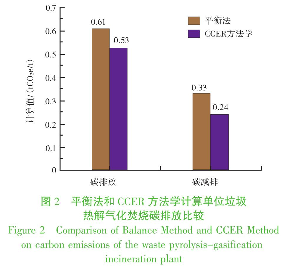 以舟山市某垃圾熱解氣化焚燒廠為例,分別采用平衡法和CCER方法學(xué)對該廠中的碳排放和碳減排量進行了對比計算。由平衡法計算得該廠單位垃圾碳排放量為0.61 tCO2e/t,其中,化石源碳燃燒產(chǎn)生的碳排放量為0.28 tCO2e/t,生物源碳碳排放為0.33 tCO2e/t(該部分可產(chǎn)生碳減排效益);CCER方法學(xué)計算所得的基準線排放量為0.53 tCO2e/t,項目排放量為0.29 tCO2e/t,項目減排量為0.24 tCO2e/t。兩種方法學(xué)的計算結(jié)果基本一致。平衡法可以對CCER方法學(xué)中項目排放量的垃圾焚燒產(chǎn)生的排放項進行補充,同時是一種簡便快捷、準確性高,價格低廉的碳排放在線分析的可行方法。但仍需對我國垃圾組分進行特定分析以完善平衡法。