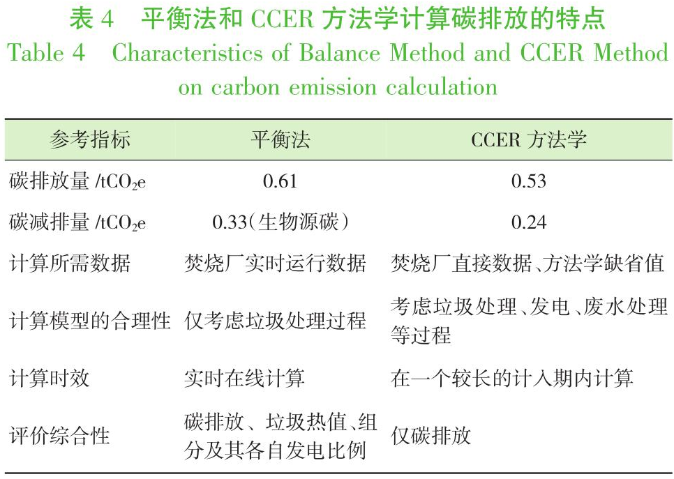 平衡法僅考慮垃圾熱解氣化焚燒過程所產(chǎn)生的碳排放。CCER方法則對包括焚燒、發(fā)電、廢水處理等在內(nèi)的垃圾處理過程進行了較完整的評價;且結(jié)果表明,該項目中,由垃圾熱解氣化焚燒產(chǎn)生的碳排放占總碳排放的比例最大。表4分析比較了兩種方法學(xué)的特點。 根據(jù)兩種方法學(xué)的特點,平衡法可以對CCER方法學(xué)計算中項目排放量的“垃圾焚燒產(chǎn)生的排放”項進行很好的補充。采用CCER方法學(xué)計算垃圾熱解氣化焚燒產(chǎn)生的碳排放時,無需對垃圾進行采集并分類到特定的垃圾類型以滿足選擇排放因子的要求,同時避免了采樣樣品代表性不足的問題。只需通過平衡法分析焚燒廠常規(guī)測量的運行數(shù)據(jù),即可計算相關(guān)碳排放值,降低了計算成本,簡便快捷、準確性高。同時,平衡法可以實時在線分析垃圾熱值,基于所得數(shù)據(jù)對焚燒爐運行進行優(yōu)化,提高垃圾熱解氣化焚燒廠的運行穩(wěn)定性和全廠效率。 然而,為了建立更為準確的平衡法,有必要對區(qū)域性的垃圾組分進行化學(xué)元素分析,得出區(qū)域垃圾中的C、H、S、N、O平均含量。