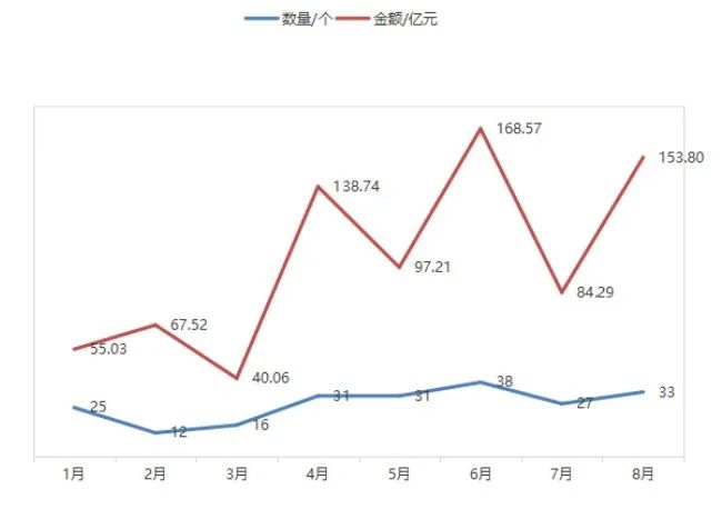 據(jù)環(huán)衛(wèi)科技網(wǎng)統(tǒng)計(jì),8月,全國(guó)共開標(biāo)了33個(gè)億級(jí)環(huán)衛(wèi)項(xiàng)目,合計(jì)中標(biāo)金額153.80億元。當(dāng)月億級(jí)環(huán)衛(wèi)項(xiàng)目開標(biāo)數(shù)量和金額僅次于6月份,是今年第二高的月份。
