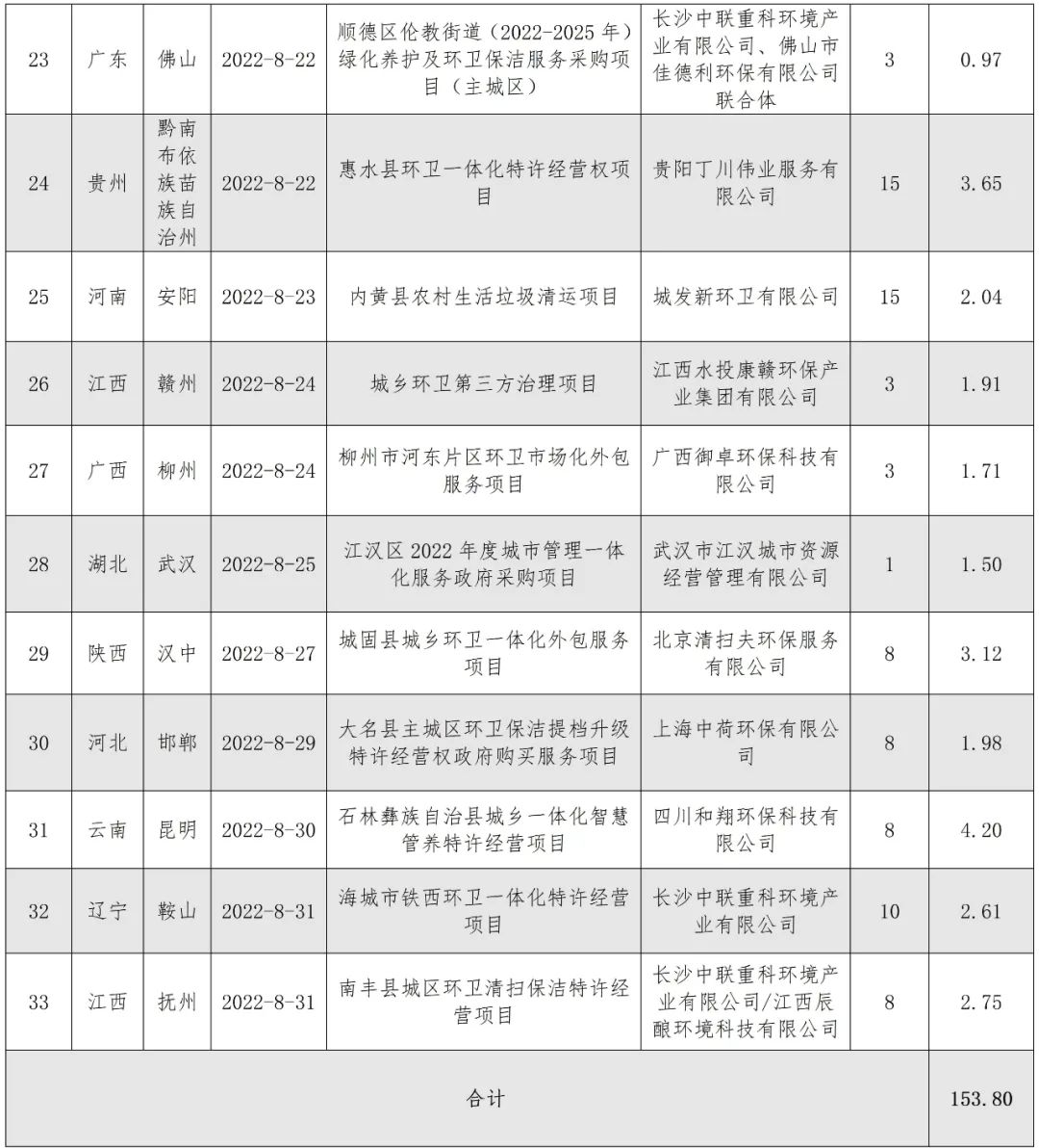 來源 | 環(huán)衛(wèi)科技網(wǎng)1、項(xiàng)目總額突破150億元,數(shù)量和金額均為年度第二!