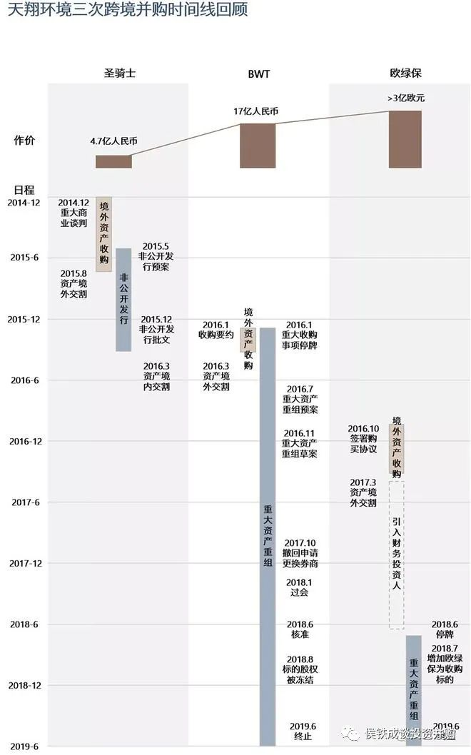 回顧天翔環(huán)境的發(fā)展歷程,核心是三次海外收購,分別是201412月收購的美國圣騎士,20161月收購的BWT公司,201610月收購的歐綠保,交易金額預(yù)期超過3億歐元。其中第一個交易順利完成,后面兩個交易只完成了體外收購,并沒有完成裝入上市公司的動作,最終也導(dǎo)致了上市公司與大股東的相繼崩盤。