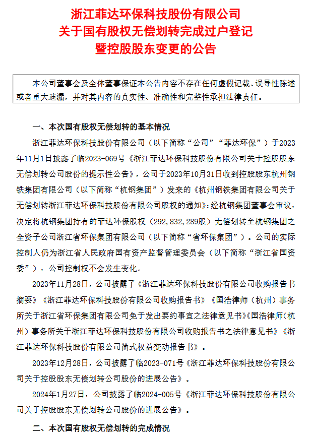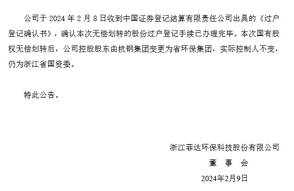 菲達環(huán)保發(fā)布公告稱,2024年2月8日收到中國證券登記結(jié)算有限責(zé)任公司出具的《過戶登記確認書》,確認本次無償劃轉(zhuǎn)的股份過戶登記手續(xù)已辦理完畢。
