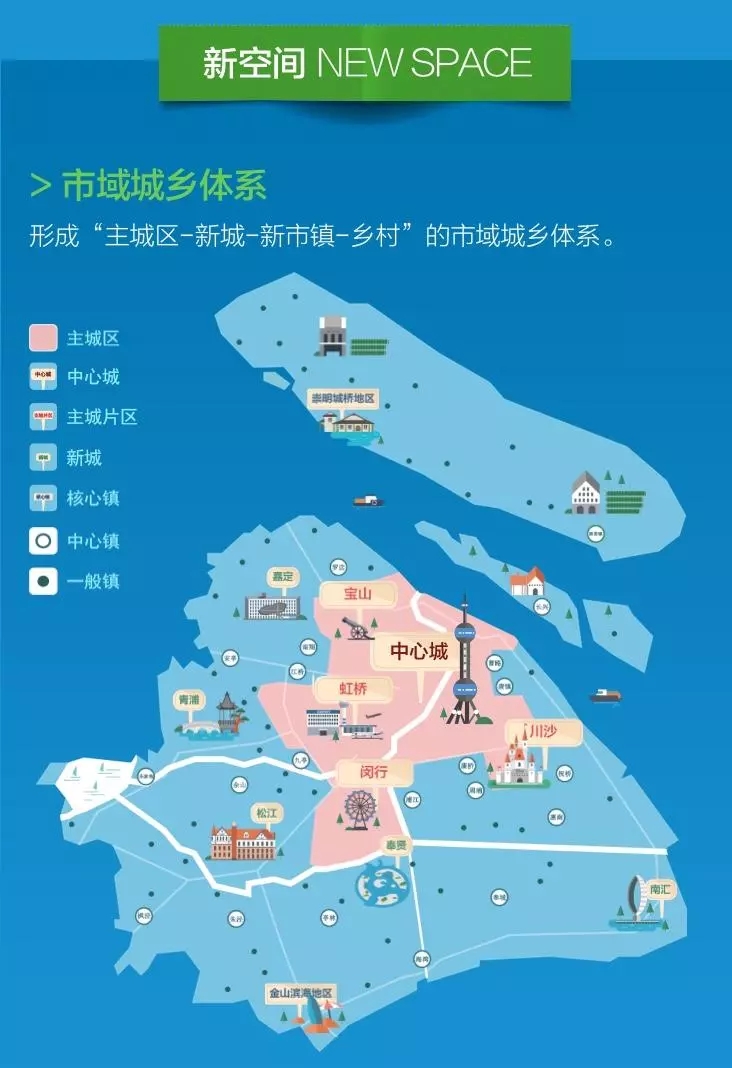 中央活動區(qū)包括小陸家嘴、外灘、人民廣場、徐家匯等十幾個區(qū)域,重點(diǎn)發(fā)展金融服務(wù)、總部經(jīng)濟(jì)、商務(wù)辦公、文化娛樂、創(chuàng)新創(chuàng)意、旅游觀光等全球城市核心功能。城市副中心包括五角場等9個主城副中心、5個新城中心和金山濱海地區(qū)、崇明城橋地區(qū)2個核心鎮(zhèn)中心等,發(fā)展面向長三角和市域的綜合服務(wù)中心,兼顧全球城市部分核心功能。地區(qū)中心和社區(qū)中心主要承擔(dān)所在區(qū)域的公共服務(wù)。