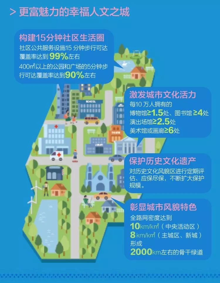 打造15分鐘生活圈,營造幸福宜居社區(qū)。包括:打造宜居、宜業(yè)、宜學(xué)、宜游的社區(qū),優(yōu)化社區(qū)生活、就業(yè)和出行環(huán)境,建設(shè)TOD社區(qū),為城市居民提供一個全時段運(yùn)營的城市。提供覆蓋全年齡段的公共服務(wù)保障,社區(qū)公共服務(wù)設(shè)施15分鐘步行可達(dá)覆蓋率將達(dá)到99%左右。加快建立多主體供給、多渠道保障、租購并舉的住房制度。多渠道增加租賃性住房比重,至2035年,政府及機(jī)構(gòu)持有的租賃性住房比重約8-10%。提供人才公寓、國際化社區(qū)、適老性住宅等滿足市民多層次、多樣化的住房需求。