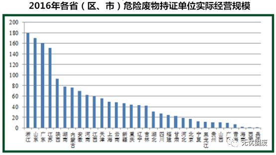 截至2016年,全國(guó)危險(xiǎn)廢物經(jīng)營(yíng)持證單位共2195家,核準(zhǔn)經(jīng)營(yíng)規(guī)模達(dá)到6471萬噸,平均每家約2.9萬噸。但實(shí)際經(jīng)營(yíng)規(guī)模為1629萬噸,平均每家不足0.75萬噸。實(shí)際經(jīng)營(yíng)規(guī)模排在前三位的分別是浙江、山東和廣東。