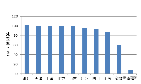其中,青海處置率最低,僅有8.3%,浙江、天津等地處置率均超過100%。