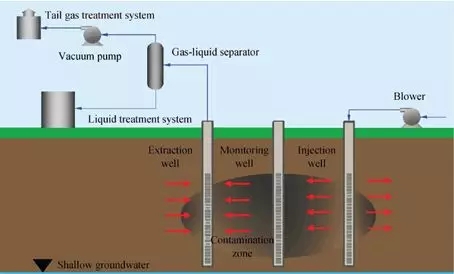 2.氣相抽提法:是去除非飽和區(qū)土壤中揮發(fā)性有機(jī)物的有效手段,通過注人井向滲流區(qū)注人空氣,同時(shí)利用抽提井產(chǎn)生低壓環(huán)境,使得土壤中存在于油相、溶解相以及吸附相的有機(jī)污染物揮發(fā)到氣相中,并經(jīng)抽提井收集到地面尾氣處理裝置中進(jìn)行回收或處理。