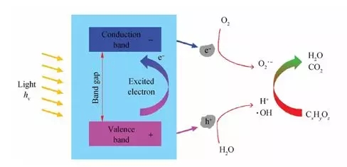 3. 光催化降解:是當(dāng)半導(dǎo)體材料吸收的光能大于或等于半導(dǎo)體禁帶寬度時(shí),電子由半導(dǎo)體的價(jià)帶躍遷到導(dǎo)帶上產(chǎn)生高活性電子e 。同時(shí),在原來的價(jià)帶上形成1 個(gè) 空 穴h+ 。產(chǎn)生的空穴具有極強(qiáng)的氧化性(即獲取電子的能力),可以與水作用形成羥基自由基·OH),從而直接將有機(jī)物降解為小分子物質(zhì)。