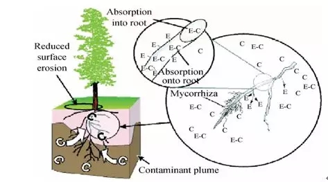 根際降解:根際降解本質(zhì)是植物根部輔助微生物降解。植物根部及其周圍微生物的相互作用,能夠顯著降低石油類污染物的毒性和持久性。首先,植物的非根部分能夠?yàn)楦刻峁┍匾臓I(yíng)養(yǎng)物質(zhì),促進(jìn)根的生長(zhǎng) ,并分泌有機(jī)物質(zhì),增加石油污染物的生物可利用性;其次,植物根部能夠創(chuàng)造富含糖類、氨基酸、有機(jī)酸、維生素 、單寧、生物堿、固醇、生物酶、生長(zhǎng)素等營(yíng)養(yǎng)物質(zhì)的多元有機(jī)環(huán)境,從而增強(qiáng)周邊微生物群落的新陳代謝活動(dòng); 最后,在根際微生物代謝作用下,將石油污染物降解為自身生長(zhǎng)必須的碳源,同時(shí)減少石油污染物對(duì)植物的毒害作用。
