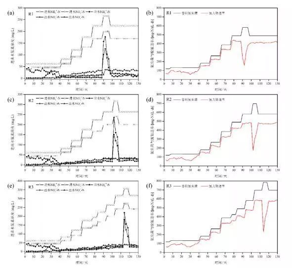 能厭氧氨氧化污泥富集培養(yǎng)過程中,為考察鐵離子的影響,反應(yīng)器保持同步容積氮負荷提升,直至運行穩(wěn)定。反應(yīng)器R1、R2、R3進出水氮素指標(biāo)、容積氮負荷及氮去除速率如圖2所示。