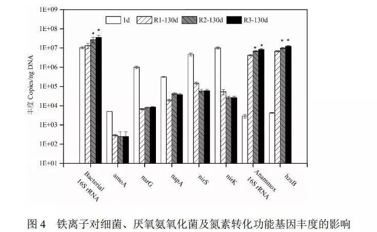 聯(lián)氨合成酶為厭氧氨氧化菌的重要功能蛋白,其編碼基因hzsB豐度經(jīng)富集培養(yǎng)過程也明顯提高;130 d時,對照組R1中hzsB豐度為6.83×106 copies/ng DNA,而試驗組R2、R3中其豐度分別為9.86×106、1.24×106 copies/ng DNA,顯著高于對照組R1(p < 0.05)??梢酝茰y,鐵離子對厭氧氨氧化菌富集具有一定促進作用,同時提高了厭氧氨氧化活性,也與反應(yīng)器脫氮效能結(jié)果一致。