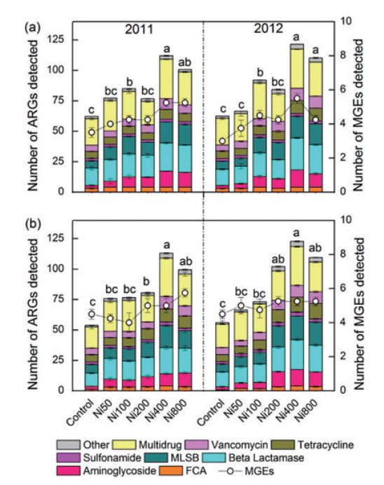 抗生素對細(xì)菌感染、致病微生物感染類疾病的防治具有重要作用,但由此而來的抗性基因的快速增加和傳播也威脅著人體健康。抗性基因的研究越發(fā)受到學(xué)者關(guān)注,成為研究熱點(diǎn)。除抗生素選擇產(chǎn)生抗性基因外,環(huán)境中重金屬對抗生素抗性的選擇和傳播擴(kuò)散具有重要作用。中國科學(xué)院生態(tài)環(huán)境研究中心Hu等通過對Ni長期污染土壤誘導(dǎo)的抗性基因進(jìn)行研究,發(fā)現(xiàn)在長期不同程度Ni污染下,共檢測到149種抗性基因,以多藥和β-內(nèi)酰胺類抗生素抗性為主,抗性基因的頻率和豐度隨Ni污染程度的增加而升高(圖3);抗性基因與可移動抗性原件具有顯著相關(guān)性,表明Ni污染增加了抗性基因的水平轉(zhuǎn)移,該水平轉(zhuǎn)移與intI1整合子有關(guān)。區(qū)別于以往重金屬的直接毒性風(fēng)險(xiǎn),該研究闡述了重金屬在土壤環(huán)境中的間接風(fēng)險(xiǎn)-增加抗性基因產(chǎn)生和傳播風(fēng)險(xiǎn)。