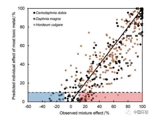 土壤重金屬污染對生態(tài)和人體健康的危害,因污染程度、污染元素種類以及暴露途徑的不同而不同。目前相關(guān)的環(huán)境風險評估和環(huán)境質(zhì)量標準的主要以單一污染物為基礎(chǔ),這與土壤重金屬污染常為多元素的復(fù)合型污染不盡一致。由于金屬間的相互作用,以及金屬與生物體作用可能表現(xiàn)為協(xié)同、拮抗或無相互作用等,導(dǎo)致多種金屬元素混合比單一元素具有不同的環(huán)境效應(yīng)。在復(fù)合污染生物毒性研究中,常用兩種模型,獨立作用(independent action)和濃度加和(concentration addition)參考模型,前者認為金屬元素毒性作用不同,后者則認為具有相似的作用效果;但是兩個模型均認為污染物在目標點位上沒有相互作用,該假設(shè)與實際情況不盡相符。比利時根特大學Nys等通過設(shè)定多種金屬復(fù)合,開展了30多組大型蚤、模糊網(wǎng)紋蚤和大麥毒性試驗,檢驗在低濃度下獨立作用和濃度加和參考模型適用性。部分重金屬單獨存在對測試生物影響效應(yīng)在10%以下,而經(jīng)復(fù)合后可產(chǎn)生高達66%的抑制作用(圖2);整體上獨立作用參考模型對混合毒性預(yù)測精度更高,濃度加和參考模型則更為保守;在風險評估中更為重要的低劑量水平上,用濃度加和參考模型預(yù)測的重金屬復(fù)合對模糊網(wǎng)紋蚤和大麥毒性比觀測值高1.4~3.6倍。該研究結(jié)果表明,目前所應(yīng)用的單一重金屬的風險評價,對于重金屬復(fù)合情況可能不夠保守。