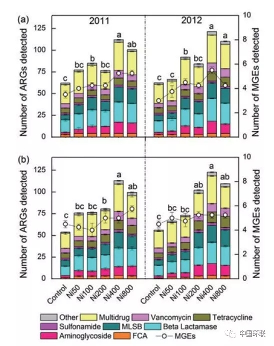 抗生素對細菌感染、致病微生物感染類疾病的防治具有重要作用,但由此而來的抗性基因的快速增加和傳播也威脅著人體健康??剐曰虻难芯吭桨l(fā)受到學者關(guān)注,成為研究熱點。除抗生素選擇產(chǎn)生抗性基因外,環(huán)境中重金屬對抗生素抗性的選擇和傳播擴散具有重要作用。中國科學院生態(tài)環(huán)境研究中心Hu等通過對Ni長期污染土壤誘導(dǎo)的抗性基因進行研究,發(fā)現(xiàn)在長期不同程度Ni污染下,共檢測到149種抗性基因,以多藥和β-內(nèi)酰胺類抗生素抗性為主,抗性基因的頻率和豐度隨Ni污染程度的增加而升高(圖3);抗性基因與可移動抗性原件具有顯著相關(guān)性,表明Ni污染增加了抗性基因的水平轉(zhuǎn)移,該水平轉(zhuǎn)移與intI1整合子有關(guān)。區(qū)別于以往重金屬的直接毒性風險,該研究闡述了重金屬在土壤環(huán)境中的間接風險-增加抗性基因產(chǎn)生和傳播風險。