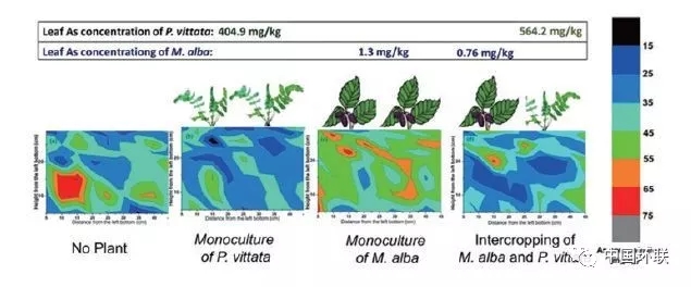 除降低可食作物對重金屬吸收外,在重金屬污染土壤上種植經(jīng)濟作物,阻控重金屬在食物鏈中的傳遞風險,也是污染農(nóng)田安全利用的措施之一。華中農(nóng)業(yè)大學Yang等針對重金屬污染土壤研究重金屬耐性經(jīng)濟作物3種種植模式(油菜-向日葵、油菜-花生、油菜-芝麻),對土壤重金屬去除效應(yīng)和農(nóng)作物中重金屬濃度的影響進行了研究。結(jié)果表明,油菜-向日葵種植模式去除Cd最高,可達459 g·ha-1,去除率為1.98%;利用正己烷提取后作物油符合相應(yīng)標準,去油后種子殘渣再經(jīng)酒石酸鉀提取后,其重金屬濃度低于飼料標準。經(jīng)濟作物與超積累植物間作,在安全生產(chǎn)的同時也能去除土壤污染物,實現(xiàn)修復(fù)目的。但是在超積累植物和其他植物間作體系下,超積累植物對重金屬活化和吸收機制還不清楚,超積累植物是否活化重金屬,增加非超積累植物對重金屬吸收。中國科學院地理科學與資源研究所Wan等開展了As超積累植物蜈蚣草和桑樹間作的研究,探討了邊生產(chǎn)邊修復(fù)機制。與單作相比,間作處理條件下蜈蚣草中As濃度顯著增加、桑樹As則顯著降低;對不同處理下土壤As的空間分布分析發(fā)現(xiàn),不論單作或間作處理蜈蚣草根周圍土壤As濃度較低,沒有活化土壤As(圖10),且在間作處理下桑樹葉中As濃度符合國家飼料標準。
