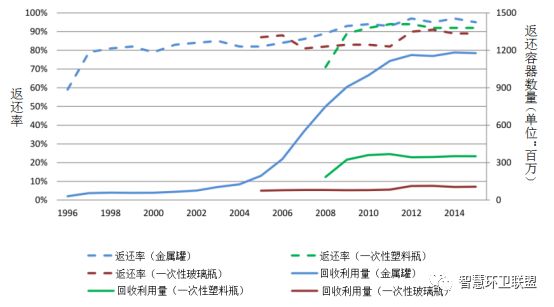 芬蘭的押金體系實(shí)現(xiàn)了極高的回收率。在PALPA體系剛剛成立的1996年,一次性金屬罐的回收率就已經(jīng)達(dá)到了59%,并馬上于第二年上升到了79%。到了2009年,金屬罐的回收率已經(jīng)超過90%。同樣地,PET瓶的押金體系在2008年開始實(shí)施時(shí),返還率就已經(jīng)達(dá)到了71%,之后在兩年內(nèi)便上升到了90%以上。玻璃瓶在芬蘭擁有很長(zhǎng)的押金制度實(shí)施積累,因此在PALPA在建立針對(duì)玻璃瓶的回收體系后,回收率就一直高于80%。從圖11還可以看出,一次性鐵罐的回收量自2004年起至2012年,一直都在迅速上升,并且保持穩(wěn)定的高回收率,反映出芬蘭飲料產(chǎn)業(yè)使用一次性金屬罐替代可重復(fù)使用玻璃瓶的趨勢(shì)??芍貜?fù)使用玻璃瓶的回收率則更高,在2014年時(shí)為97%、2015年時(shí)為98%。