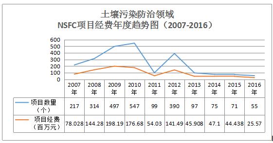 通過統(tǒng)計2007-2016十年內(nèi)我國國家自然科學(xué)基金的項目數(shù)據(jù),可知土壤污染防治領(lǐng)域的項目經(jīng)費在2007-2010年呈穩(wěn)步上升趨勢,2010年申請通過的項目達峰值547個,2011年有所回落,2012年又激增到390個,之后幾年呈現(xiàn)了下降趨勢,2016年僅通過55個項目,經(jīng)費也隨之下降,如圖9所示。