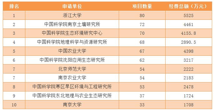 通過項目數(shù)據(jù)分析(見圖10),土壤污染防治領(lǐng)域在面上項目獲得的經(jīng)費十年總經(jīng)費額度排名第一,共計4.35億元,青年科學(xué)基金項目排名第二,約為2.13億元。排名第三位的為重點項目,共計1.02億元。面上項目是相對于重點項目而言,由于選題廣泛所以占比比其他類型要高。但是由于2013年起基金委出臺新政策,嚴格把控項目質(zhì)量。因此導(dǎo)致近幾年資助經(jīng)費呈下降走勢。