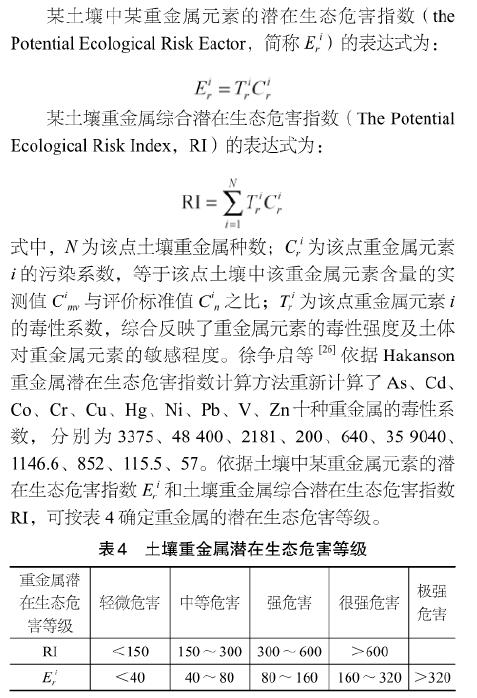 6)致污染物質(zhì)的潛在生態(tài)危害評(píng)價(jià)。潛在生態(tài)危害指數(shù)法是瑞典地球化學(xué)家Hakanson于1980[21]創(chuàng)建的,是以沉積學(xué)原理評(píng)價(jià)環(huán)境重金屬污染及其生態(tài)危害的方法。由于該方法同時(shí)考慮了重金屬的種類、濃度、毒性水平及土體對(duì)重金屬的敏感性等因素,較為科學(xué)合理,因此,被廣泛應(yīng)用于土壤環(huán)境質(zhì)量評(píng)價(jià),國(guó)內(nèi)有不少學(xué)者[22-26]在評(píng)價(jià)土壤環(huán)境質(zhì)量時(shí)應(yīng)用了這種方法,并進(jìn)行了較深入的研究。