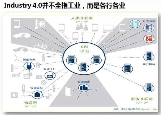 我們國(guó)家理解工業(yè)4.0有一定的偏差,因?yàn)楣I(yè)4.0這個(gè)詞我們國(guó)家翻譯成工業(yè),實(shí)際上日本和德國(guó)包括美國(guó)認(rèn)為是產(chǎn)業(yè)的意思。按照它們的理解,工業(yè)是工業(yè)化、智能制造,農(nóng)業(yè)變成智慧農(nóng)業(yè),建筑也是信息化加上建筑工業(yè)化、自動(dòng)化,形成智慧建筑,醫(yī)療也是智能化、智慧醫(yī)療。實(shí)際,德國(guó)人搞工業(yè)4.0不僅是工業(yè)領(lǐng)域,而是各行各業(yè)的智能化。
