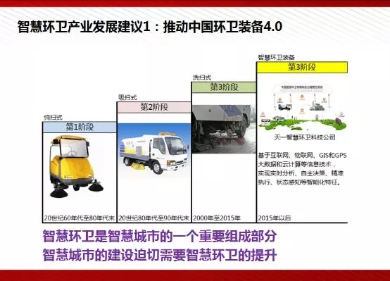 第一,推動(dòng)中國(guó)環(huán)衛(wèi)裝備4.0。以馬路清掃機(jī)為例,60天年末是第一階段,純掃式的,80年代到90年代末有吸式,把土吸進(jìn)去,有了新的進(jìn)行。2000年到2015年可以一邊掃一邊洗,未來(lái)是智慧環(huán)衛(wèi)階段?;锫?lián)網(wǎng)、GDP等信息技術(shù)實(shí)現(xiàn)時(shí)時(shí)分析、精準(zhǔn)執(zhí)行。未來(lái)環(huán)衛(wèi)裝備也要過(guò)渡到4.0。