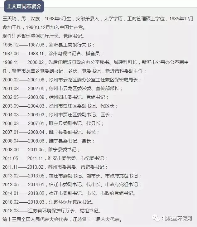 3月28日,江蘇省第十三屆人民代表大會(huì)常務(wù)委員會(huì)第二次會(huì)議通過(guò),王天琦為江蘇省環(huán)境保護(hù)廳廳長(zhǎng)。