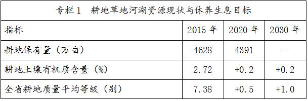 ——耕地。到2020年,嚴守耕地紅線,耕地土壤環(huán)境安全得到基本保障。全省耕地保有量不低于292.73萬公頃(4391萬畝),基本農(nóng)田保護面積不低于246.2萬公頃(3693萬畝),建設旱澇保收高標準農(nóng)田96.53萬公頃(1448萬畝),建成高標準農(nóng)田2825萬畝。全省耕地質(zhì)量平均提高0.5個等級(別),其中新建成的高標準農(nóng)田耕地質(zhì)量平均提高1個等級(別)以上;耕地土壤有機質(zhì)含量有所增加,耕作層厚度平均達到25厘米以上;實現(xiàn)化肥、農(nóng)藥使用量零增長,環(huán)境風險得到基本管控;實現(xiàn)耕地土壤酸化、重金屬污染、殘膜污染等突出問題基本解決,試點休耕的重金屬污染區(qū)、生態(tài)嚴重退化地區(qū)的生態(tài)和農(nóng)產(chǎn)品質(zhì)量安全問題得到初步解決,重點地區(qū)和試點地區(qū)探索出適于全省借鑒的耕地養(yǎng)護、輪作、休耕工作方案,完成25度以上坡耕地以及重要水源地15至25度非基本農(nóng)田坡耕地新一輪退耕還林、調(diào)出基本農(nóng)田任務。