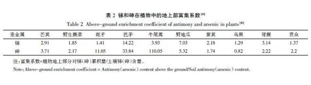 土壤中銻形態(tài)的分布特征會對其在土壤-植物體系中的富集轉(zhuǎn)運能力產(chǎn)生一定影響。相關研究者比較了蜈蚣草、斑矛、五節(jié)芒、粽葉蘆對砷和銻的轉(zhuǎn)運能力,發(fā)現(xiàn)只有五節(jié)芒和粽葉蘆從根部到地上部(莖/葉)對銻具有較好的轉(zhuǎn)運能力,而4 類植物對砷都表現(xiàn)出了良好的轉(zhuǎn)運能力,說明銻在植物體中的轉(zhuǎn)運能力相對于砷較弱。文吉昌等的研究結(jié)果(表 2)表明,除了個別植物對銻的富集能力大于砷外,其余植物對銻的富集能力均遠小于砷。也有研究表明,植物地上部的銻含量與根部含量之間沒有相關性(r=0.19),植物吸收的銻并非單一來自土壤的釋放,還有一部分可能來自大氣沉降,進一步表明了銻在植物中具有較弱的富集轉(zhuǎn)運能力。