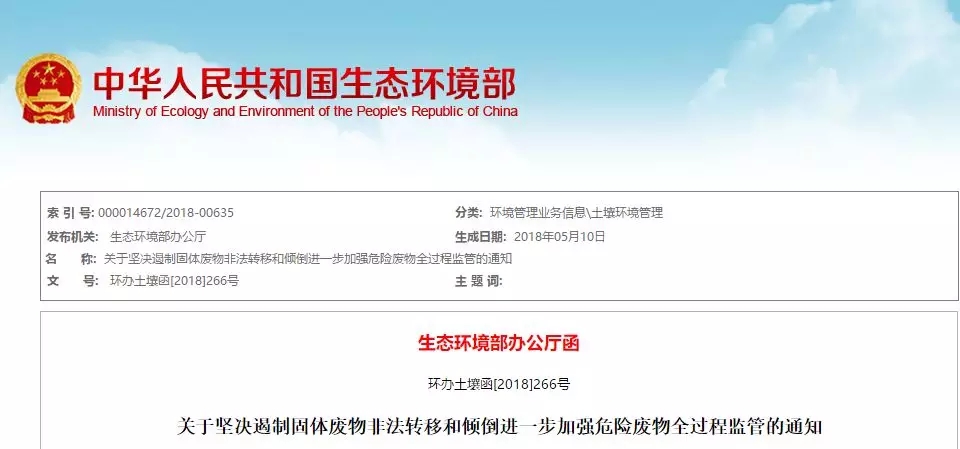 生態(tài)環(huán)境部日前印發(fā)了《關(guān)于堅(jiān)決遏制固體廢物非法轉(zhuǎn)移和傾倒 進(jìn)一步加強(qiáng)危險(xiǎn)廢物全過程監(jiān)管的通知》(環(huán)辦土壤函〔2018〕266號(hào),以下簡(jiǎn)稱《通知》)。
