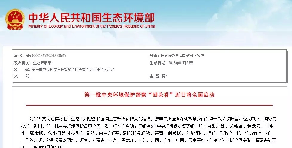 為深入貫徹落實(shí)習(xí)近平生態(tài)文明思想和全國生態(tài)環(huán)境保護(hù)大會(huì)精神,按照中央全面深化改革委員會(huì)第一次會(huì)議部署,經(jīng)黨中央、國務(wù)院批準(zhǔn),近日,第一批中央環(huán)境保護(hù)督察“回頭看”將全面啟動(dòng)。