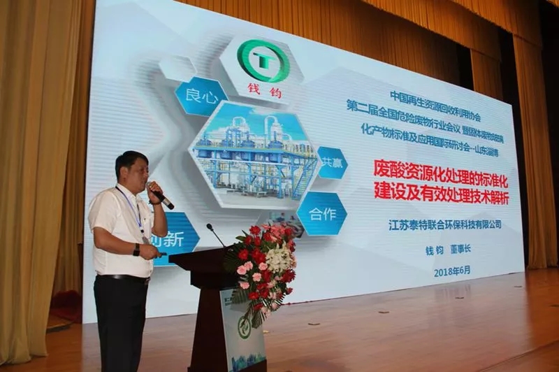 江蘇泰特聯(lián)合環(huán)保科技有限公司董事長(zhǎng)錢鈞以“廢酸資源化處理的標(biāo)準(zhǔn)化建設(shè)及有效處理技術(shù)解析”為主題,概述了廢酸資源化處理的緊迫性及標(biāo)準(zhǔn)化建設(shè)發(fā)展方向,梳理出涉及到的相關(guān)政策法規(guī),并分享了泰特公司鋼制品鹽酸酸洗廢液的有效處理技術(shù)。