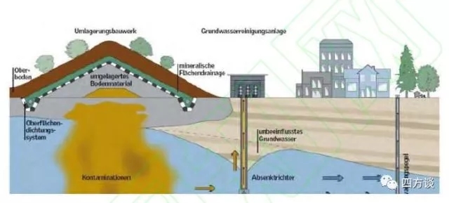 (2)隔離封閉,把污染物集中并用隔離膜封閉(Sicherungsmassnahmen)。當(dāng)污染物污染比較嚴(yán)重,分布范圍大、深,且對(duì)地下水也已經(jīng)造成污染,這種情況下,對(duì)污染源進(jìn)行清挖、換土費(fèi)用太高,一般選擇就地隔離封閉處理,阻止污染物進(jìn)一步向外擴(kuò)散。具體做法是:把場(chǎng)地的污染土壤集中在一起,堆成山丘,鋪上隔離層(一種很厚的塑料膜,使用壽命100余年),以免繼續(xù)污染地下水或者空氣。在隔離層之上鋪大約2米厚的可供植物生長(zhǎng)的新土層,進(jìn)行景觀再造,改造成為休閑場(chǎng)所,如圖2所示。